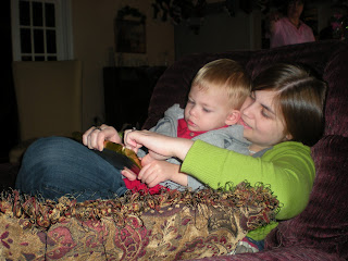 Parker sat in Aunt Kia's lap to open presents. For some reason he can't say Kari and calls her Kia - it's so funny. At least he doesn't call her Matt anymore!